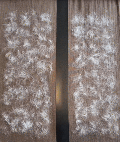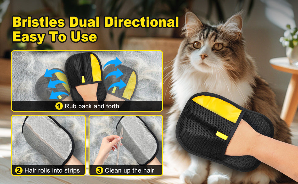 Answer 1: The gloves feature a special mesh material on both sides that effectively collects and removes pet hair through gentle brushing. Simply wear the gloves and stroke your pet, and the hair will adhere to the surface, making it easy to clean up afterwards.